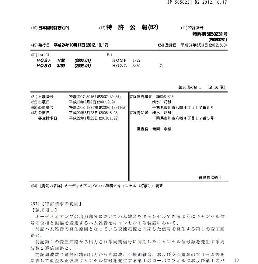 还有,2012年,日本清水 紀雄的申请专利:音频放大器交流声消除电路,也有参考价值~国外有很多类似专利,限于个人能力、精力,有时间吧,我再多介绍。