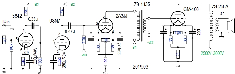 不管你是否接受交流灯丝好听这一事实,我做胆机,二十年来一直坚持使用交流灯丝,除非不得已,比如这个GM-100,按照不反馈原则,我反复试验过多次。还是不能把噪音调至可接受的程度。记得日本直热管佐久間(Sakuma-san已故)说:“没有交流声陪伴的音乐不是好声音”。哈哈哈,有交流声干扰真的让人心烦。大家都知道,我喜欢用交流点灯丝,比如2A3、300B单端,通过各种途径减小交流声,积累了一定的经验。下面就详细谈谈,直热管交流点灯丝、无反馈状态的电路设计: