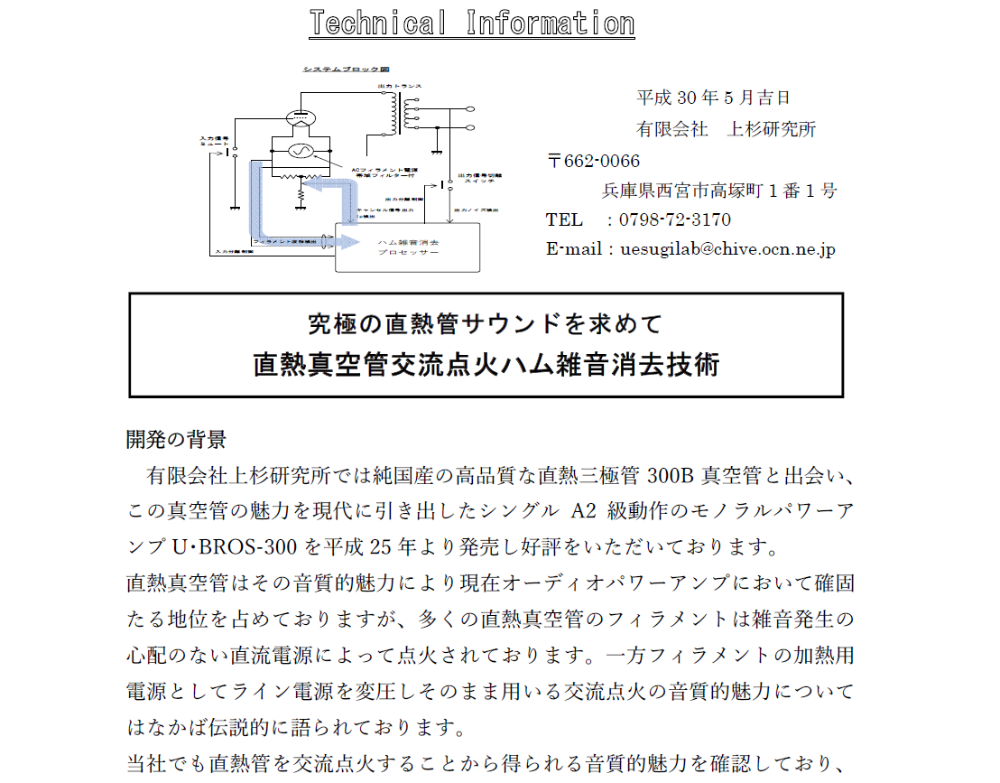 日本上杉2018年(平成30年)发布的文章《寻找终极的直热管交流点火噪音消除技术》,也就是上杉U-BROS-300AH胆机采用的电路,应该也属于此范畴,号称专利,销量排名第二。
