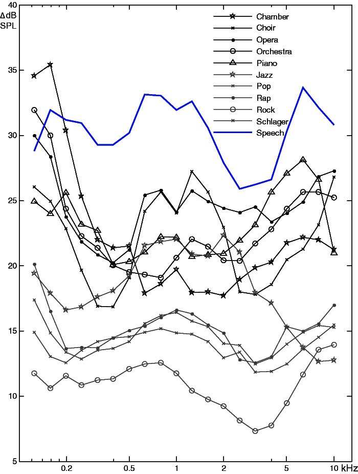 以上这些,是经过母带工程师,有意加工处理,制作在载体上的音乐的动态范围,不同的载体、不同的制作甚至不同的版本,结果会有一定差异。跟现实、现场情况可能相差较多,比如正规的古典音乐现场,动态范围可能高达90dB!