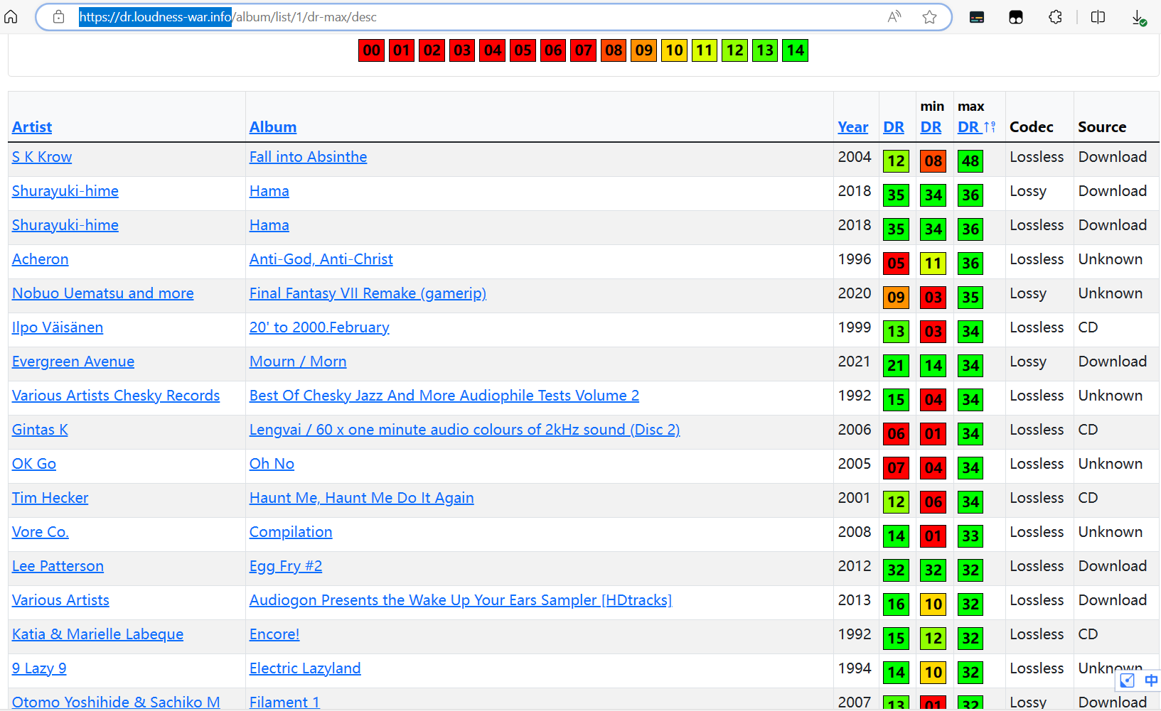 大量动态范围压缩通常对音频质量不利,但压缩程度取决于流派和其他因素。一张带有 DR 6 的专辑听起来并不一定很糟糕。一张带有 DR 12 的专辑不一定听起来不错(但至少不应该责怪 DR)。对于摇滚/金属,DR 为 8 及以上被认为是可以的。您可以点击DB标签,查看DB值从大到小或从小到大的顺序查看。