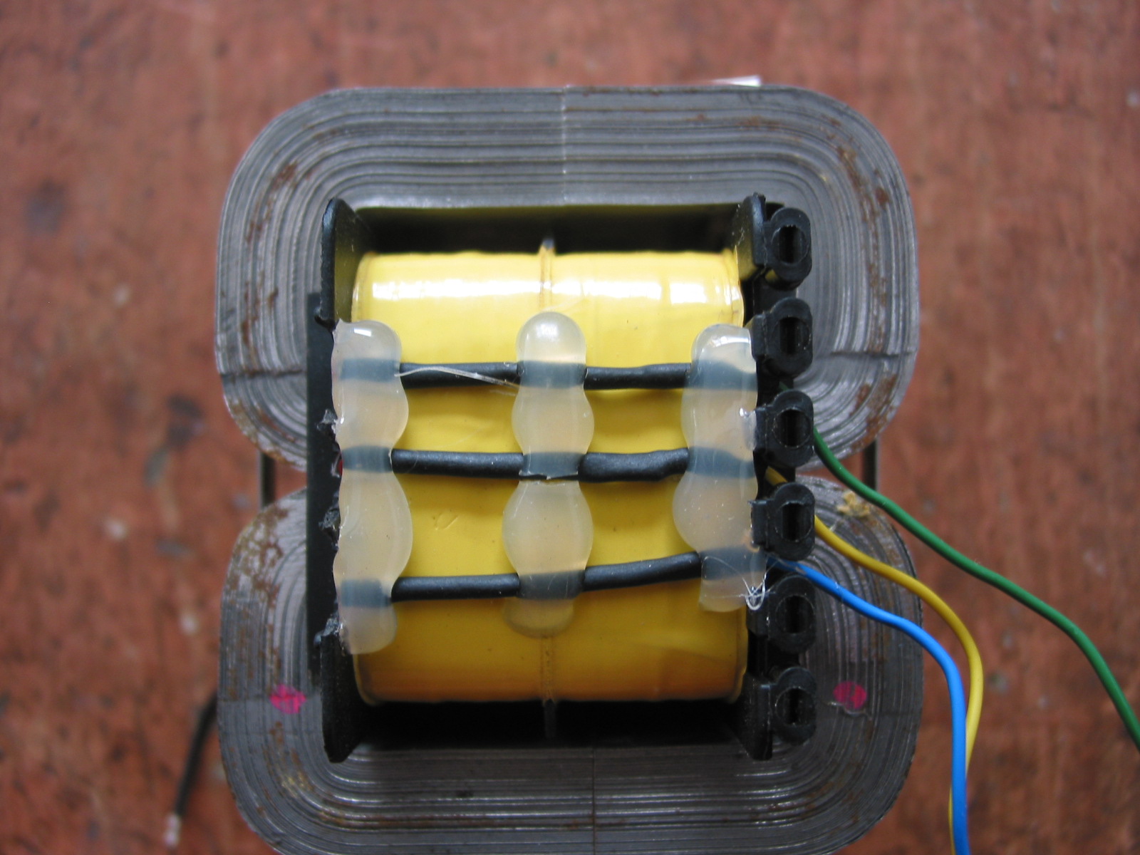 这个几十圈的小线绕电阻,是做什么用的呢?接线图见上图。紧贴在线包的外侧,好像是温度保险一样。根据接线图,串连在第一段次级的首端。经过分析,我认为这个小电阻,主要作用就是均流保护(就像并联管子有均流电阻一样),因为第一段次级紧靠内圈,绕组内阻比较小,加上内圈散热不好,容易引起恶性循环导致整体变压器出现问题。,可以想像发热是肯定的。