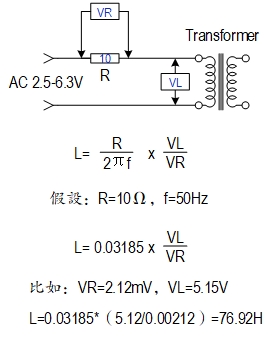有关电感的测量(前面文章我已经有多次提到),也可以按照下面公式,业余条件下就可以轻松计算变压器初级电感(Tango变压器经常采用这样测试后标出相应数据):玩胆机的朋友,手头很容易找到2.5V-6.3V的交流电压(测试小信号牛不要用较高电压,否则铁芯容易饱和。同理可用于测试输出变压器,参见之前的文章),然后找一个10欧姆左右的电阻,测量出实际阻值是多少(注意首先短路测试表笔,看一下读数是多少,减去这个数才是实际阻值),然后按照下面计算方法,轻松知道自己变压器初级电感值。
