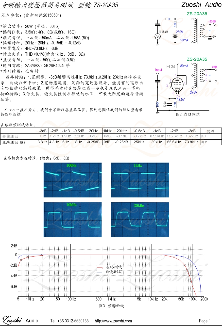 左氏☆ 幅频特性:20Hz~20kHz -0.25dB ~ -0.12dB(KT66在路实测);左氏