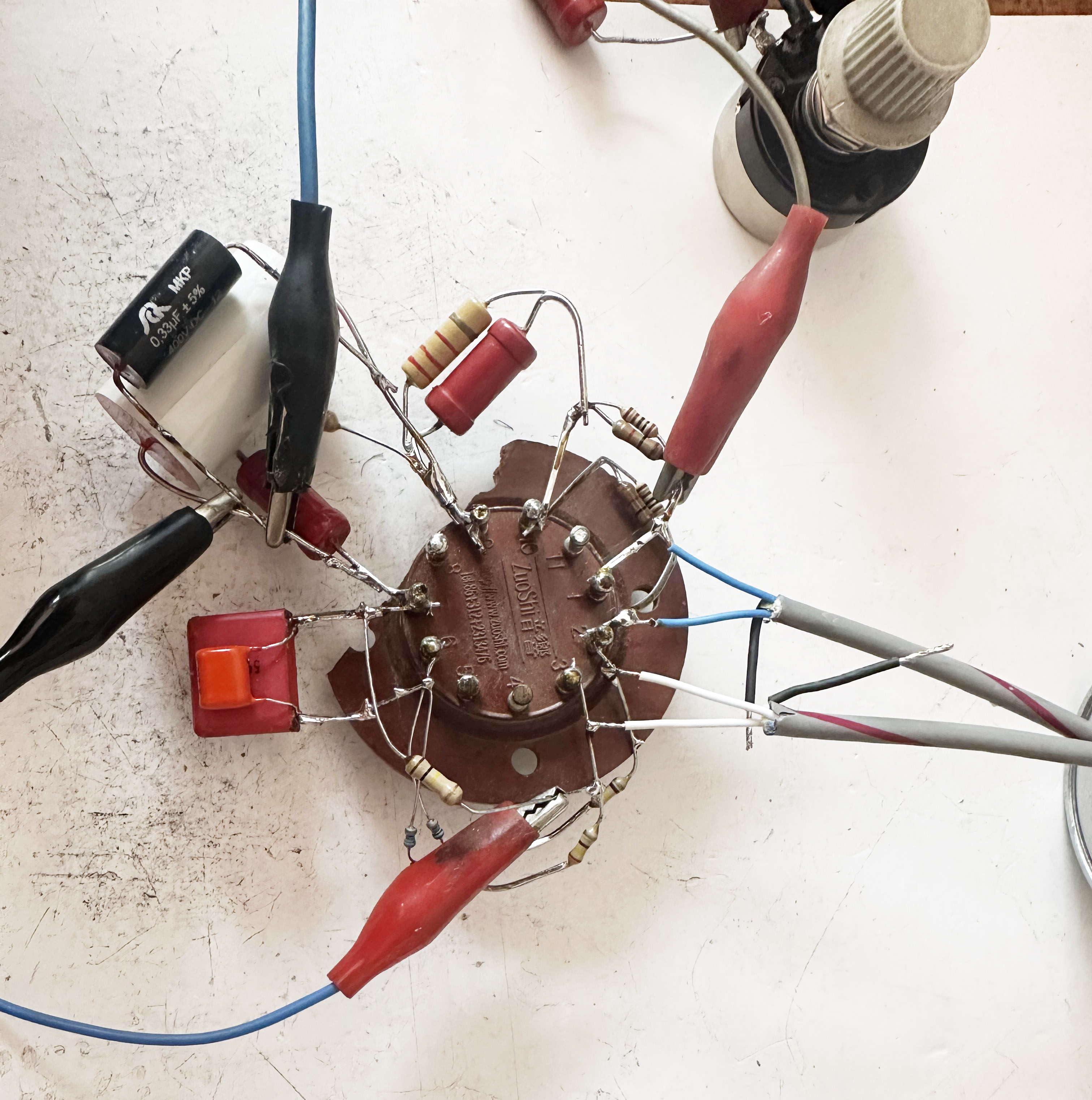大家可以看到,就算是外部引出端子,也特别制作了直径1.2mm的镀金铜针,而放弃了普通的大接线柱,以尽量避免端子本身感应的噪音。假如把全部RC元件集成到这个屏蔽罩内,做成EQ-600P那样的集成均衡单元,可以让噪音做到更小~当然这会让元件调整变得稍微麻烦。